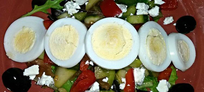 • Serve the salad decorated with hard boiled eggs, crumbled cheese, parsley and olives.