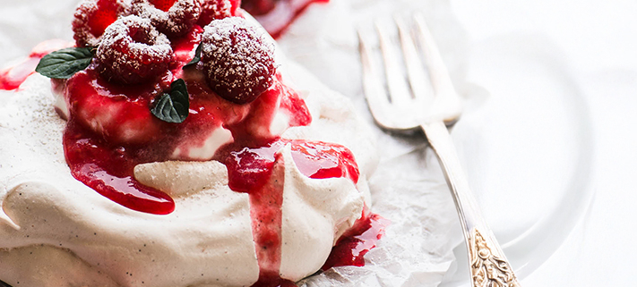 • Put the cream on top of the raspberries and decorate with meringues.