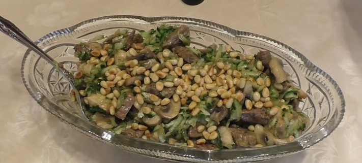 • Combine the cucumbers, beef and mushrooms in a bowl. Add 3-4 Tbsp. olive oil as a dressing. Stir. Add salt and pepper to taste.